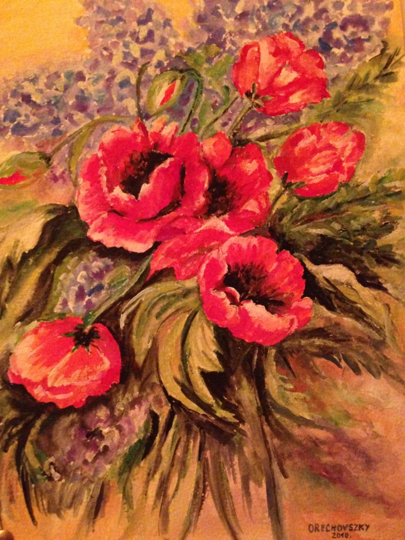 Tavaszi-nyári színkavalkád mutatkozik a festményen az orgona tavaszias-, és a pipacs nyárias árnyalatai által.