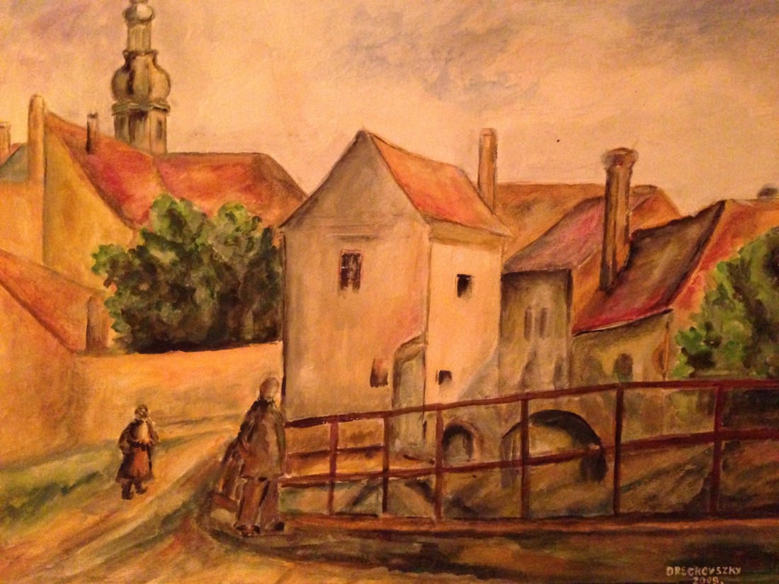 A festményen a Tűztorony, a város jelképe magasodik az ég felé, az Ikva patak partjáról nézve. Régi képeslapról készült.